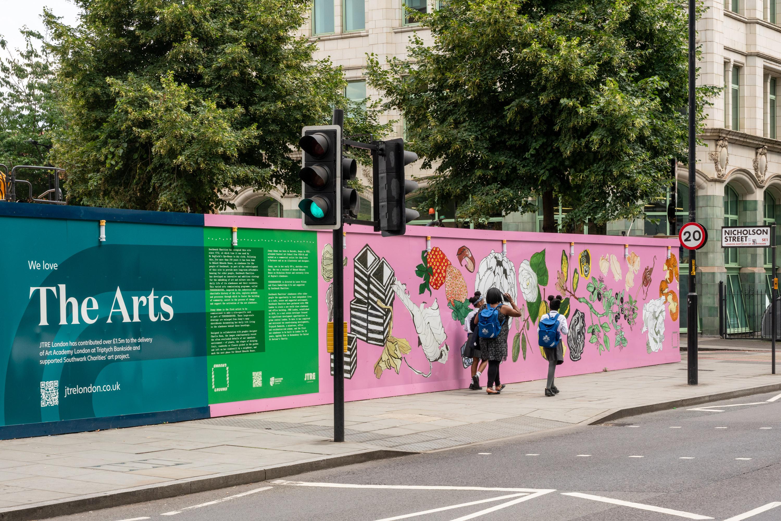 In Summer 2024 children aged 2–4 visited Jenny Adam’s artwork on the hoardings around the Blackfriars Road building site, and took part in a drawing workshop with Jenny at Blackfriars Settlement. They then made their own artistic response which has been collaged into panels for the nursery garden