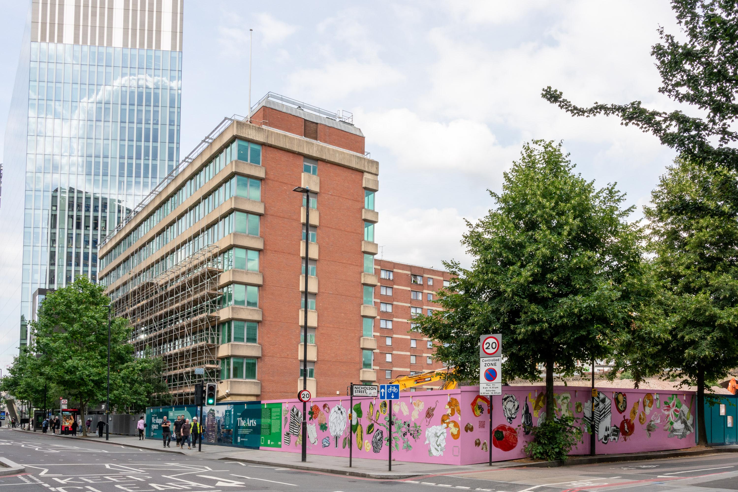 Tenderground’s inaugural public commission featured our own artist in residence, Jenny Adams, an Edward Edwards resident, invited to make a site-specific work for the hoardings which surround the almshouse site during the redevelopment of the almshouse building. The large-scale drawings are enlarged from Jenny’s many sketchbooks documenting her daily life living in the almshouse behind these hoardings.
